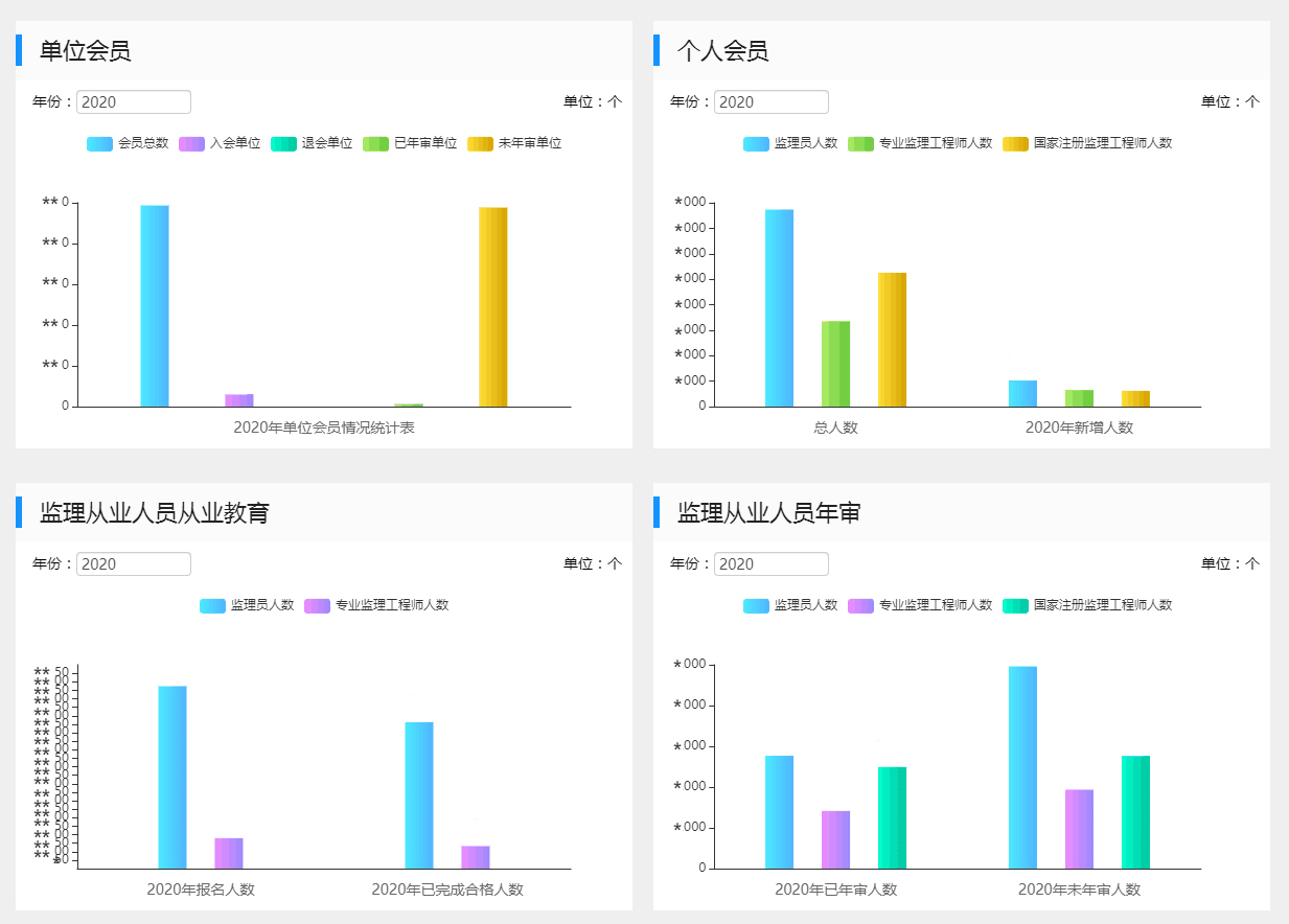 2. 会员管理系统:帮助协会高效管理企业会员及个人会员、并为企业会员提供便捷服务。系统核心功能包含:企业会员管理、从业人员管理、教育培训管理、专家管理、项目管理、信用管理等。管理门户多维度汇总分析协会各项重要数据,图表化直观展示,方便协会及时获取并输出各类重要信息。