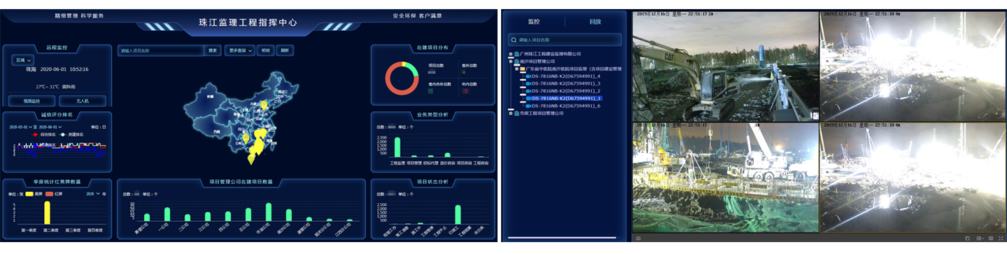 本期系统建设内容包括:管理门户、市场经营、项目运营、业务管理(1+4,即监理+代建、造价、招标代理、全过程咨询)、人力资源、财务管理、OA办公、党建管理、知识管理、技术管理、系统管理、移动APP、公司网站等16个子系统,涉及业务流程313个,系统基于我司监理通V8平台开发完成,采用企业微信作为移动APP平台,此外,为珠江监理搭建了项目指挥中心大屏,提供项目地图、项目红黄牌、企业诚信排名等栏目,集成了智慧工地监控中心,集成了第三方视频会议系统,满足总部与项目部视频对话需求,实现无人机实时图像传输及远程工地视频监控。
