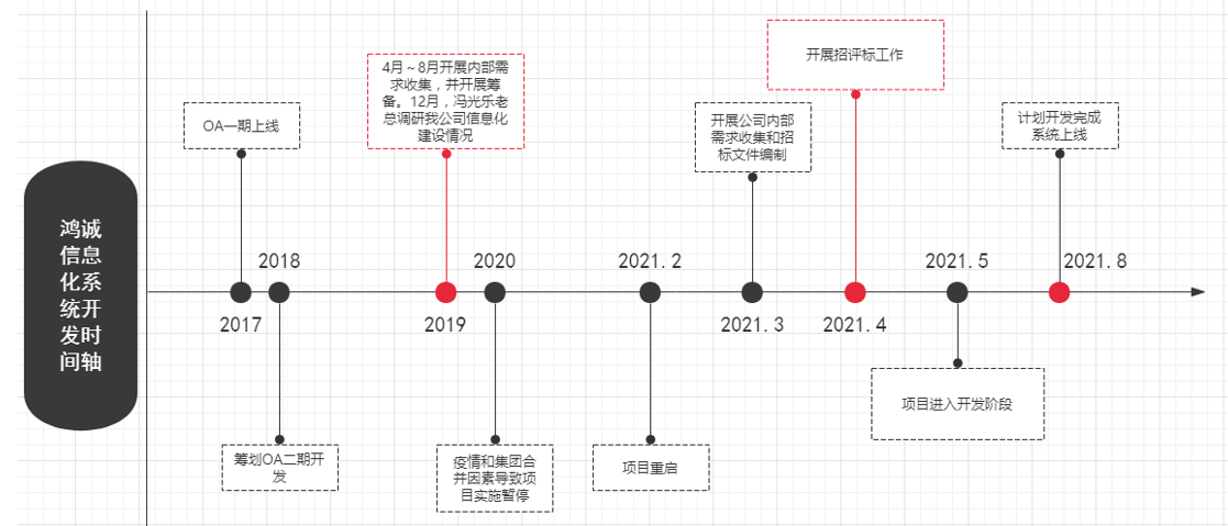 武汉鸿诚信息化一期建设在2016年开始,并于2017年上线使用。随着公司规模和业务的发展,公司业务从原来单一的业务逐步拓展到监理、招标、造价、代建、全过程等多元化业务,业务覆盖区域也从原来仅武汉当地拓展到全省和全国,必须要有更能匹配公司发展的信息化平台来支撑办公和管理,同时充分执行和参考国务院国资委正式印发《关于加快推进国有企业数字化转型工作的通知》的有关内容,推动公司信息化、数字化建设。2021年启动二期建设规划,通过多方考察,并公开招标评比,最后选择了行业内服务经验最多、技术和产品能力最优、市场占有率最高、在武汉设立有分公司可提供属地化服务的广东世纪信通网络科技有限公司进行合作。