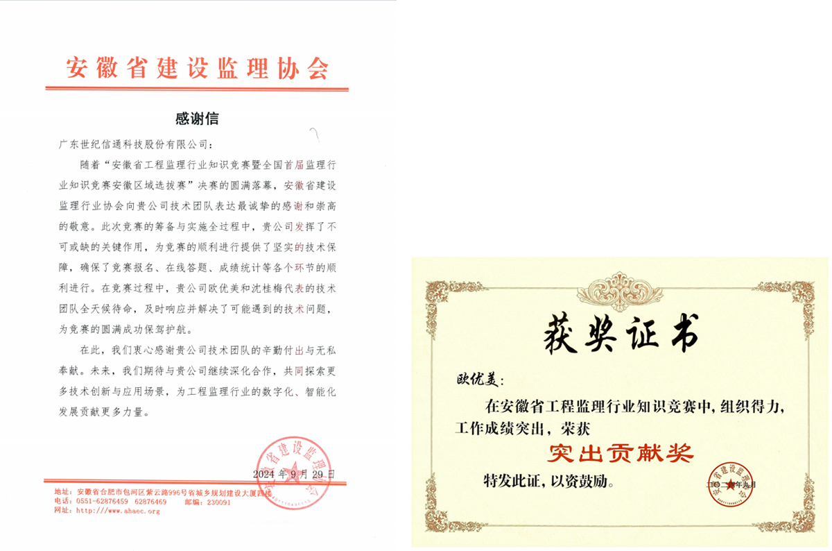 时间:2024-11-01 09:44:06 浏览数:1589近日,安徽省工程监理行业知识竞赛暨全国首届监理行业知识竞赛安徽区域选拔赛圆满落幕,作为平台技术支持方,我司收到了来自安徽省建设监理协会的感谢信,特此感谢我司信通云学堂技术团队在本次知识竞赛中,从筹备到实施全过程提供的坚实技术保障,为竞赛的圆满成功保驾护航,我司信通云学堂实施经理欧优美因在安徽省工程监理行业知识竞赛中,组织得力,工作成绩突出,荣获突出贡献奖。