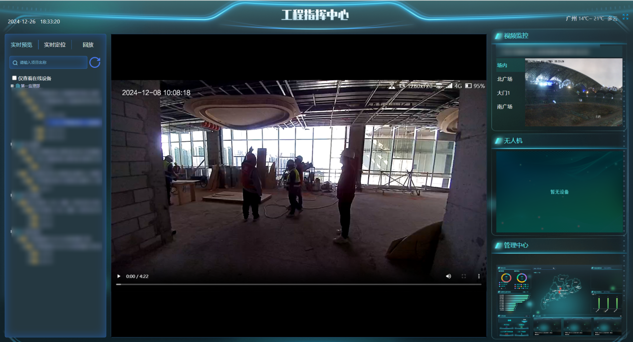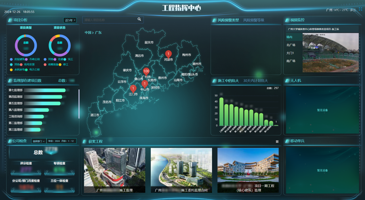面临工程监理项目分布散、区域分布广、项目监管难等情况,本期通过云计算、大数据、IOT等技术手段,结合智能终端穿戴设备使用(视频监控、智能移动单兵(记录仪)、无人机),搭建工程管理智慧指挥中心,配套项目管控三级管理体系,加强总部对项目部管理、项目现场工作情况远程实时监控、远程应急指挥调度、远程专家支撑、远程项目检查,将科技力量与质量、安全监管制度紧密集合,进一步落实安全监管责任,综合提高公司对工程项目统筹管控和施工现场质量安全管理水平,实现质量安全管理模式创新。
