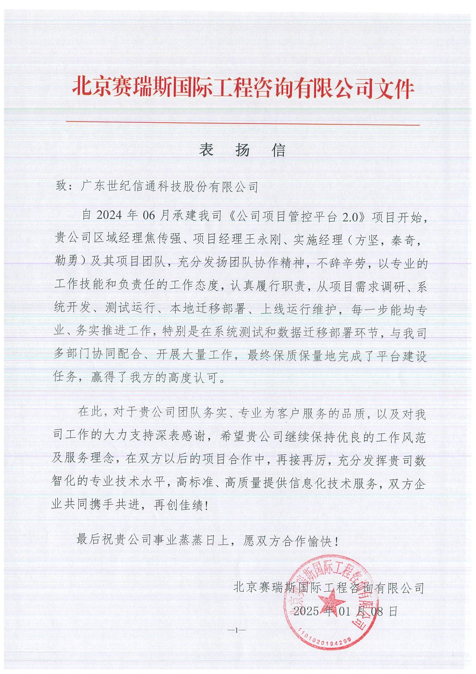 时间:2025-01-11 10:15:48 浏览数:18712025年1月8日,北京赛瑞斯国际工程咨询有限公司(以下简称:北京赛瑞斯)成功举办了《公司项目管控平台2.0》系统发布会。北京赛瑞斯公司党委书记、总经理曹雪松,副总经理翟云明、朱保山参加发布仪式;m6登录入口app(以下简称:广东世纪信通)区域总监焦传强作为平台承建方代表出席会议。