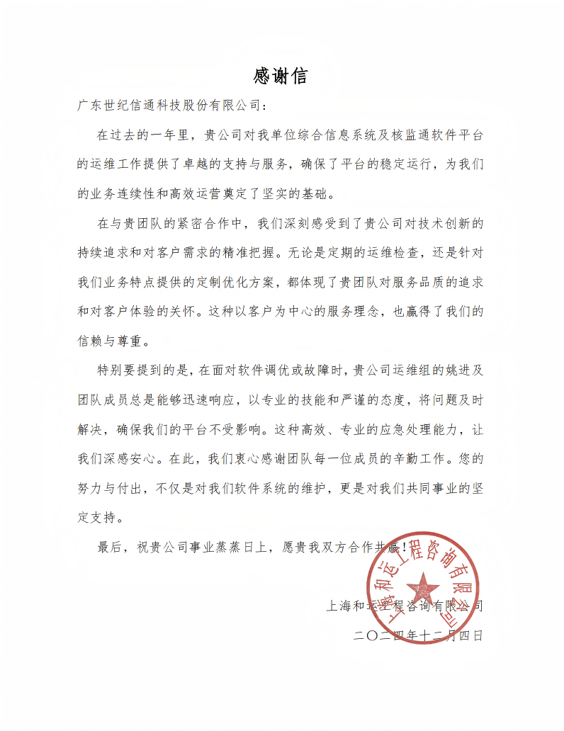 在这封感谢信中,上海和运咨询特别指出:“在过去的一年里,贵公司对我单位综合信息系统及核监通软件平台的运维工作提供了卓越的支持与服务,确保了平台的稳定运行,为我们的业务连续性和高效运营奠定了坚实的基础。在与贵团队的紧密合作中,我们深刻感受到了贵公司对技术创新的持续追求和对客户需求的精准把握。无论是定期的运维检查,还是针对我们业务特点提供的定制优化方案,都体现了贵团队对服务品质的追求和对客户体验的关怀。这种以客户为中心的服务理念,也赢得了我们的信赖与尊重。”