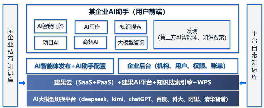 建果AI平台以“AI大模型+N智能体应用”作为核心架构,采用了私域知识库、向量数据库、RAG、LLMflow、ES搜索引擎、视频智能分析、AI写作等多项技术,并将DeepSeek强大的自然语义处理、多模态数据分析、预测与推理等能力,融合到企业管理和项目管理各环节,为客户提供智能问答与溯源、知识检索、报告生成、表单助手、数据查询、智能审查等应用。