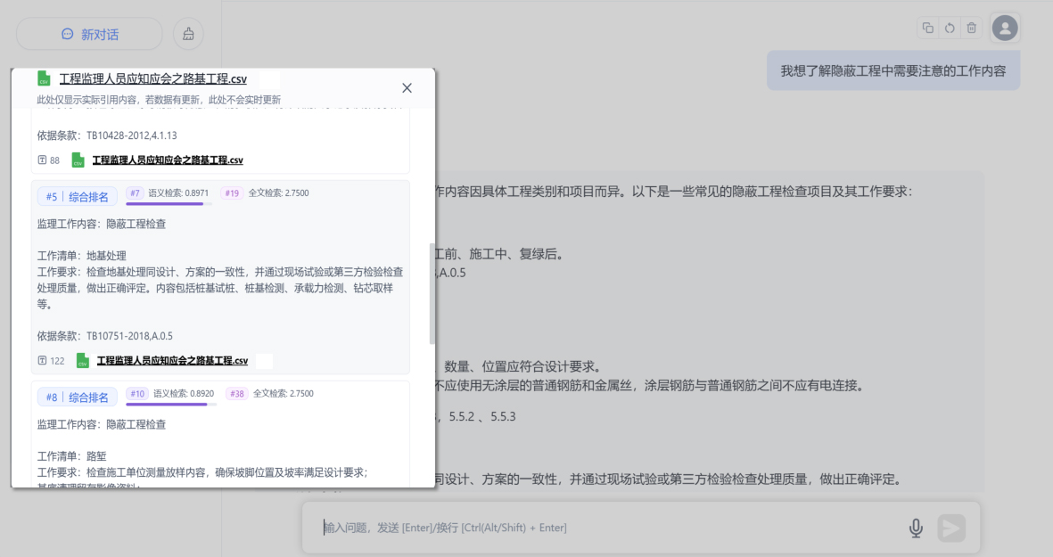 02. AI智能问答:通过大模型的分析和预测能力,结合企业知识库特定内容,提供一对一文字或语音智能对话,结合企业私有知识内容,AI智能问答能够更全面理解用户场景,深入解决工程复杂问题,并支持查阅具体的索引条目。