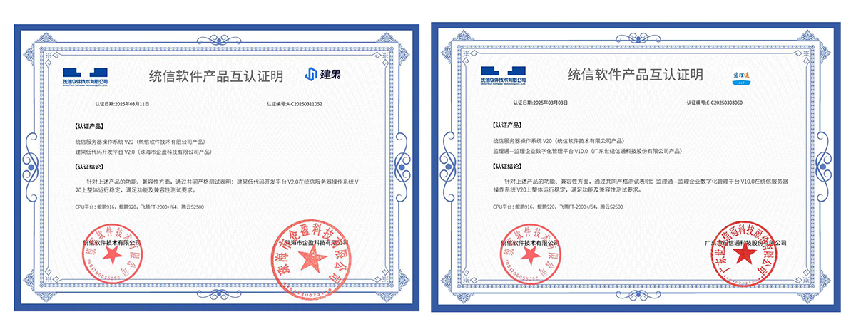 国产化适配意义重大 在关键领域的信息化建设中,操作系统的自主可控是保障数据安全与业务连续性的核心,此次国产化适配认证含金量高,深度适配银河麒麟与统信 UOS 两大国产主流操作系统,可全面满足企业客户对数据主权和系统安全的需求。具体来说,获得的统信 UOS 互信证书包含统信 V20 的 A-龙蜥版与 E-欧拉版,可适配鲲鹏、飞腾、腾云等ARM架构 CPU平台;还有银河麒麟 V10飞腾版与鲲鹏版,同样在ARM架构下表现卓越。这意味着,无论企业客户采用何种国产芯片和操作系统,建果低代码平台与监理通 V10 都能安全稳定运行,完全符合国家信创标准要求。