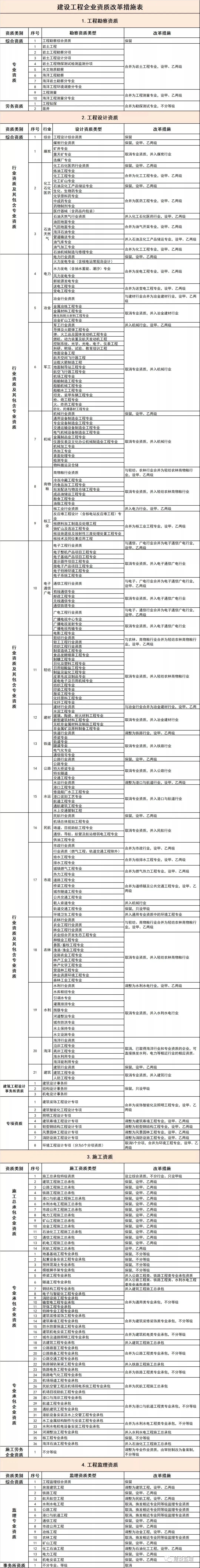 本次改革力度很大,涉及施工/专业承包/设计/监理等资质,多项资质被取消/合并。