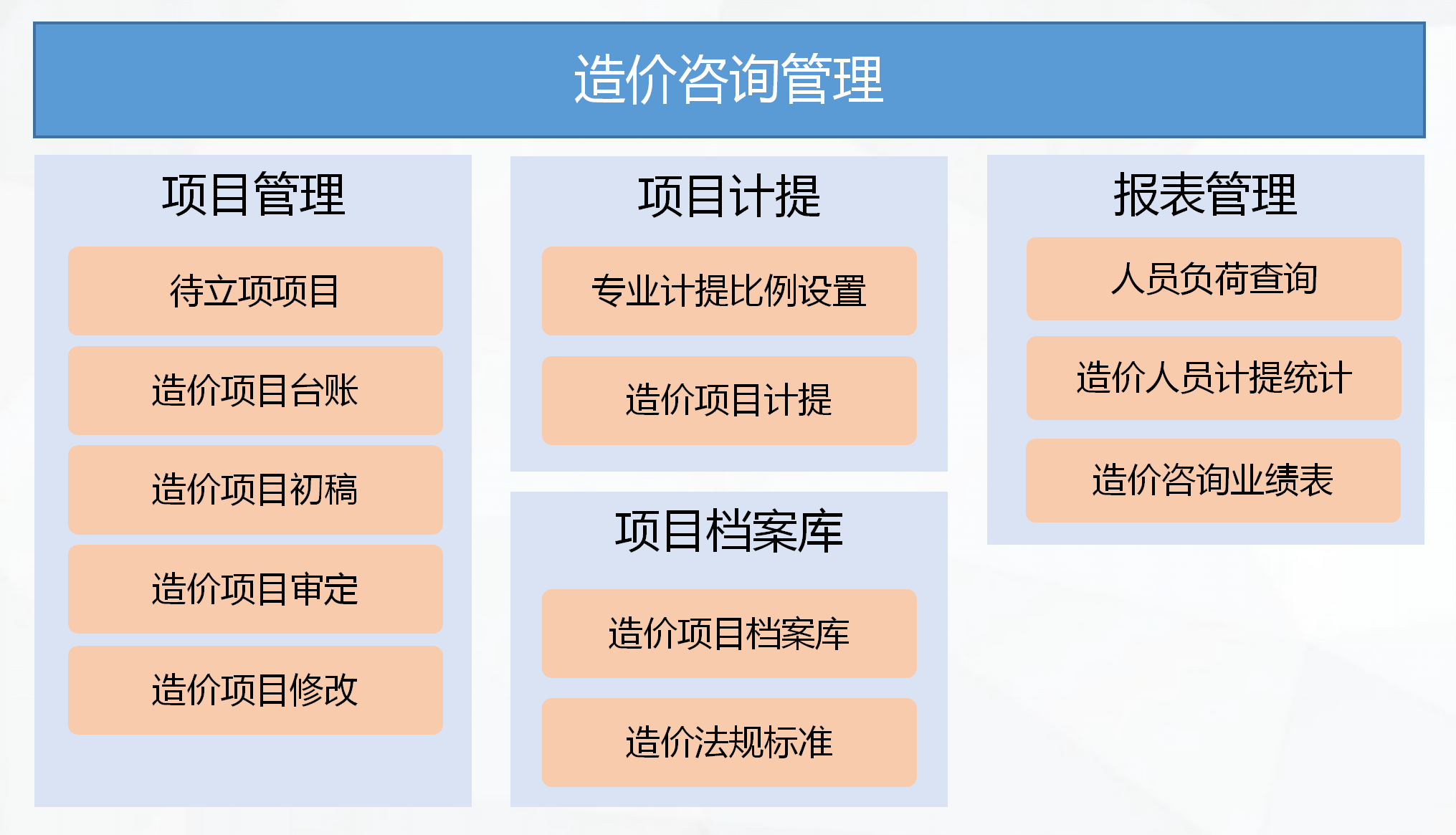 造价咨询产品是专门为工程监理造价咨询业务部门和专业造价咨询机构提供的内部管控系统。系统从造价咨询的合同签订,到任务分配,到成果文件三级复核审批,到成果报告文件签发,到发票开具和项目收款,再到项目档案的归档以及项目咨询业绩计提,各业务环节环环相扣,真正实现了项目的过程化动态管理,体现出管理软件与现实业务的紧密结合,而不是单纯的资料录入与保存。