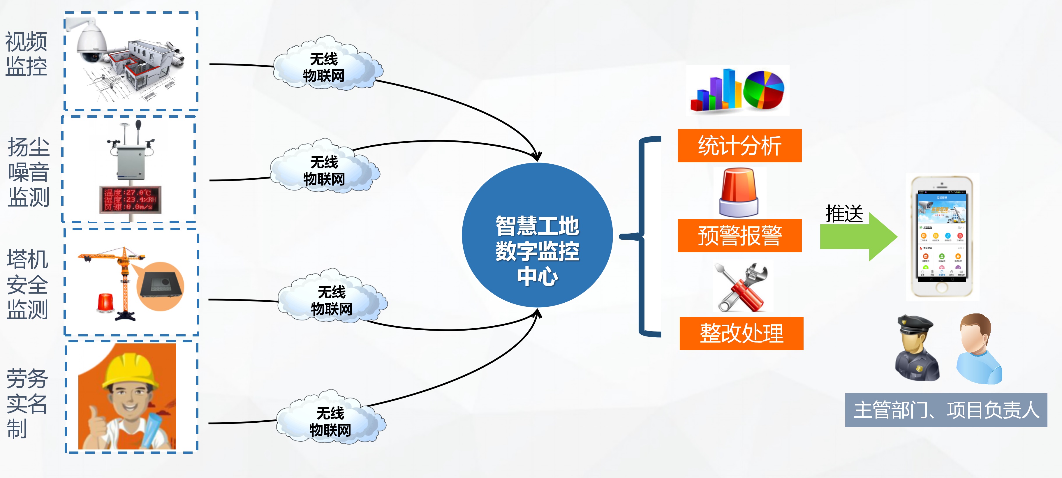 数字工地系统是为施工单位提供的数字化施工解决方案,由视频监控中心、环境监测监控系统、塔机安全监控系统、工地实名制管理系统、移动执法管理系统等多个系统组成,对工程项目中人、机、料、法、环的进行全方位智慧管控,让工程管理从被动“监督”转为主动“监控”。