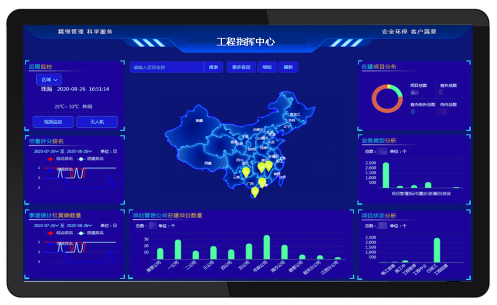 综合大屏工程指挥中心集成项目中关健的各类信息,并以可视化的形式展示在本平台中,实时反映项目中的各类信息的变化,实时掌握公司项目的情况。